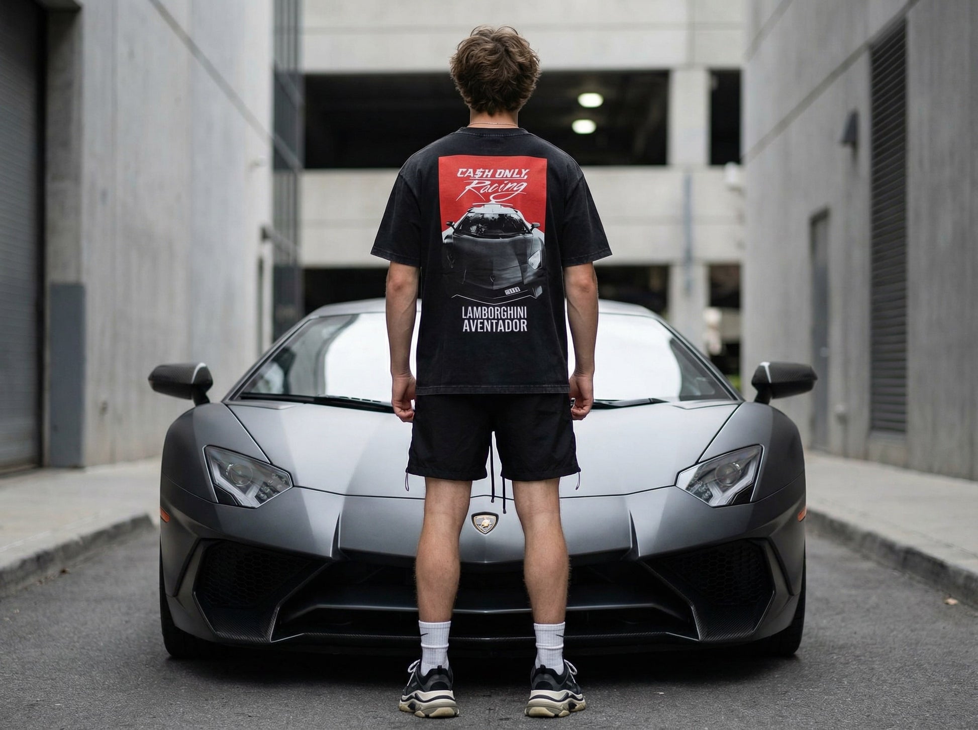 Enjoy the fit and finish of the oversized fit Cash Only Racing vintage T shirt featuring the Aventador.
